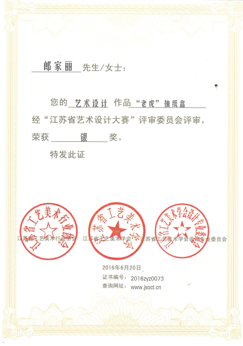 近日,在由江苏省工艺美术学会、江苏省工艺美术行业协会、江苏省工艺美术学会设计专业委员会联合主办的“2016江苏省艺术设计大赛”中,美术公司郎家丽老师作品《“老虎”抽纸盒》获得了环境艺术设计类银奖。