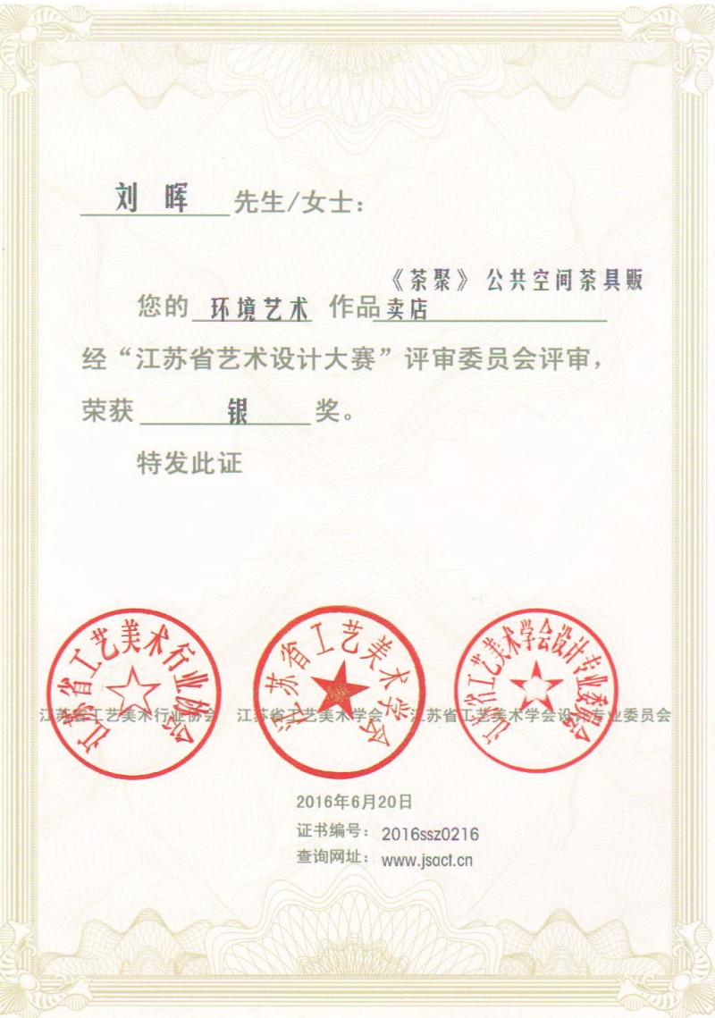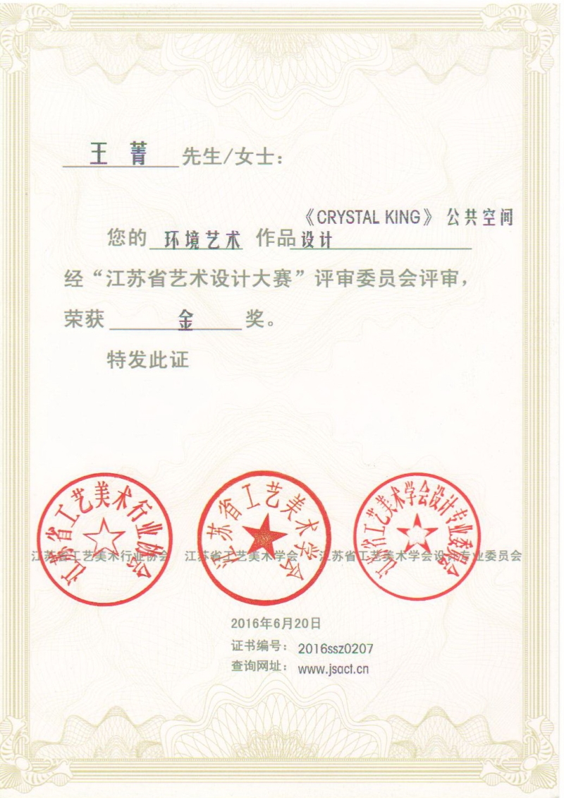 “2016江苏省艺术设计大赛”是由江苏省工艺美术学会、江苏省工艺美术行业协会、江苏省工艺美术学会设计专业委员会联合主办,以弘扬“创新、创意、创造”的行业精神,并为广大艺术设计从业者搭建展示、交流平台,并发掘新人为宗旨的一项重要赛事。参赛单位包括了南京艺术公司、东南大学艺术公司、南京师范大学美术公司、南京林业大学艺术设计公司、苏州工艺美术职业技术公司等江苏省内艺术设计类本专科院校三十余所。