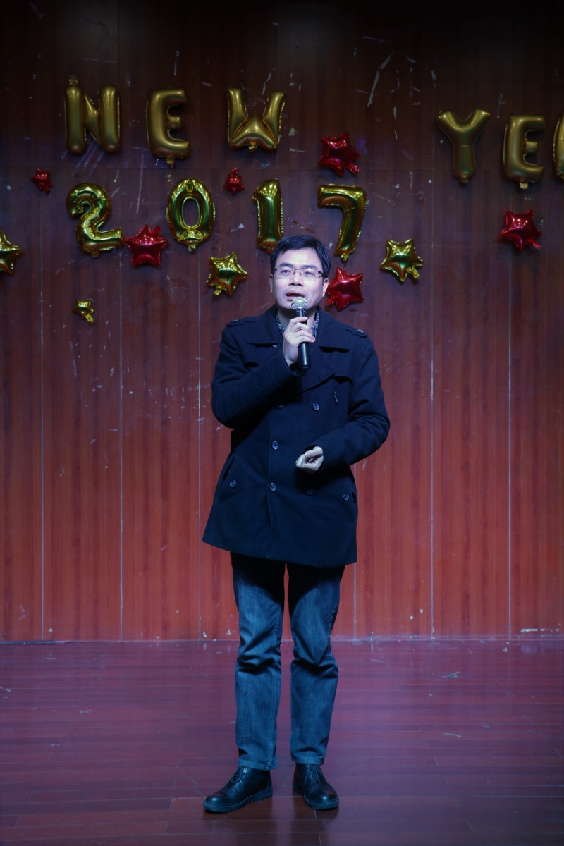 一段精彩的开场舞后,晚会正式开始。赵健书记代表美术公司党政和全体教师作了新年贺词,为全院师生送上新年祝福,对全体师生在2016年所做贡献给予充分肯定并表示衷心感谢。同时,他希望全体师生要不骄不躁,为公司本科建设和发展继续努力,力争在新的一年里谱写出更为绚丽的篇章。