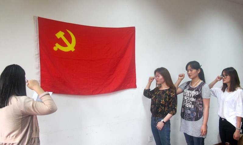 会后,在方荣同志带领下,三位党员同学再次在党旗下重温了入党誓词。