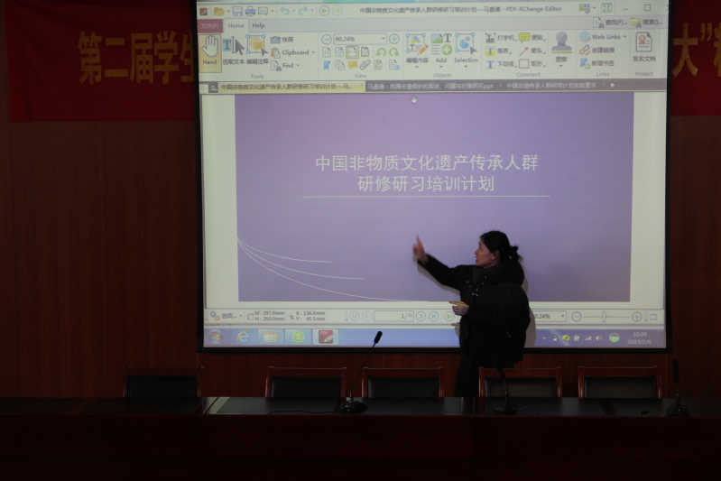 班主任黄珏老师带领学员一起研读了非遗公约,并且站在一名非遗研培管理者的角度,从研培活动的起源、发展、培训的目的和要求等方面对学员进行了详细的说明,并介绍了其他高校研培过程中涌现出的优秀作品。