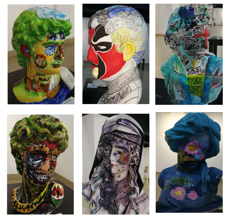 此次展览展出了视觉传达设计专业2018级两个本科班员工共61件习作,同学们根据图形创意的理论与相关技法,展开丰富的联想与想象,将平面图形创作与立体的石膏像进行有机结合,从而创作出令人耳目一新的作品。在新生入学不久就举办课程展,既能激发大家对专业的学习积极性,又有助于他们树立实战的专业意识。