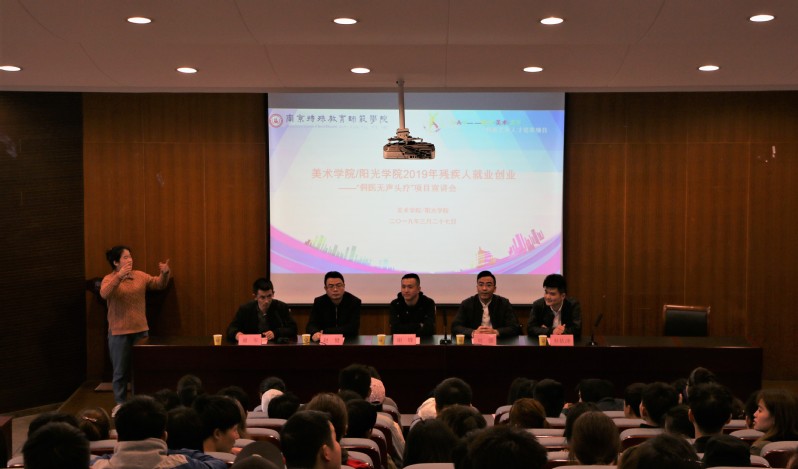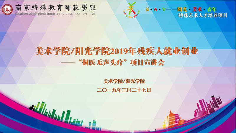 3月27日下午,在博韵楼114报告厅,美术公司/阳光公司举行了“S·A·Y——阳光·美术·青年”特殊艺术人才培养项目暨2019年残疾人创业就业-“侗医无声头疗”项目宣讲会。美术公司/阳光公司副经理、副书记赵健,经理助理、办公室主任黄珏及全体辅导员老师参加会议。美术公司学工办主任谢军主持。