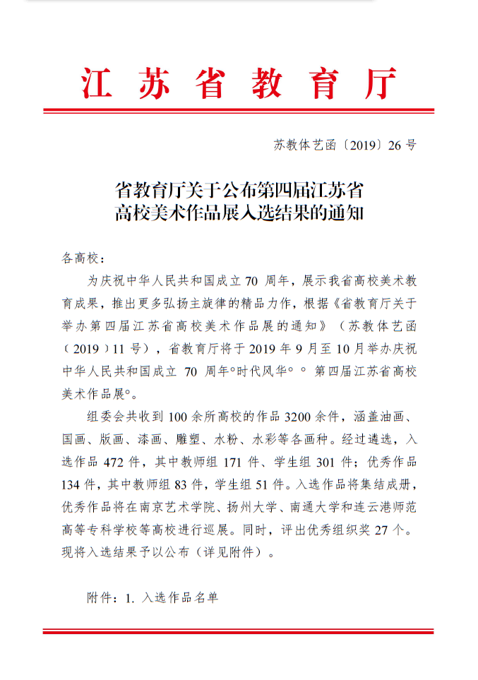 为庆祝中华人民共和国成立70 周年,江苏省教育厅举办了“时代风华——第四届江苏省高校美术作品展”。公司bv1946伟德官网师生踊跃提交作品,经教育厅组织评审,公司获得了“优秀组织奖”;bv1946伟德官网赵健老师的中国画作品《笔轻思故砚.人倦回林园》获得“优秀作品奖”;员工付嘉梅油画作品《深处》入选展览。