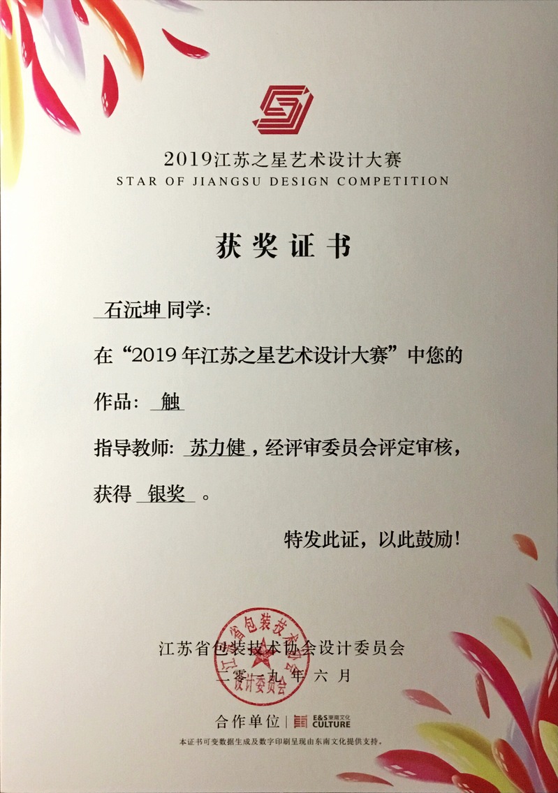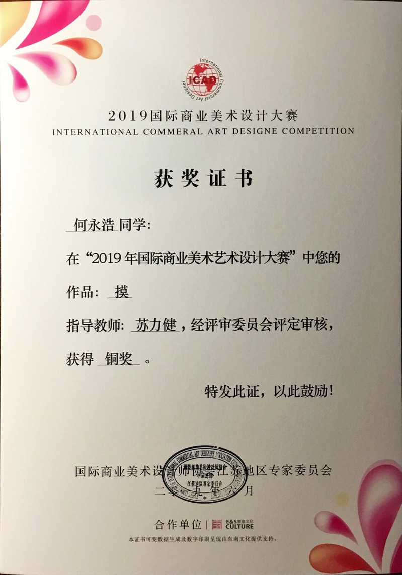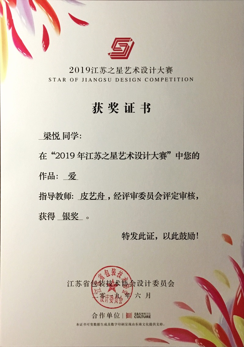 bv1946伟德官网通过上半年多次选拔,并在指导老师指导下,视觉传达设计专业11位同学在“2019江苏之星艺术设计大赛”和“2019国际商业美术大赛(中国江苏)”再获佳绩,获得两项银奖、四项铜奖及五项优秀奖,为公司近年以来获奖数最多的一届。