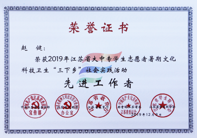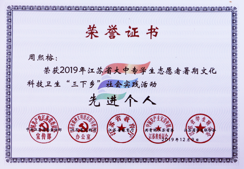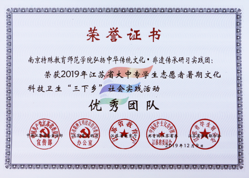 公司bv1946伟德官网“弘扬中华传统文化•非遗传承研习实践团”荣获2019年江苏省大中专员工志愿者暑期社文化科技卫生“三下乡”社会实践活动“优秀团队”,团队指导教师赵健荣获“先进工作者”。“‘幸卉’园艺治疗服务小分队”的团队负责人周熙榕同学荣获“2019年江苏省大中专员工志愿者暑期社文化科技卫生‘三下乡’社会实践活动‘先进个人’”荣誉称号。