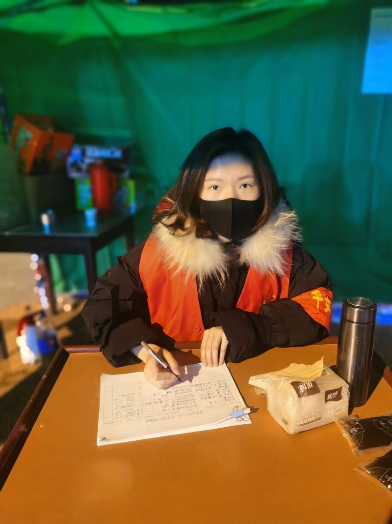 她志愿服务的地点是靖江与如皋的交界处,近期人们陆续复工,治安卡口来往车辆较多,负责人需要不断维持交通秩序,与警察、护士等防疫工作人员并肩作战,协助配合做好相关工作,测量体温、登记外地车辆、检查出入通行证等等。她相信只要我们同心协力、共同努力,并肩作战,就一定能打赢这场硬仗,我们的心与你们同在,武汉加油!中国加油!
