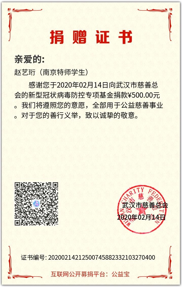 她是来自bv1946伟德官网1803班的赵艺珩,面对来势汹汹的疫情,看到那奋战在一线的医护人员们不畏艰辛,共同抗疫,让她倍受感动,为此她向武汉市慈善总会捐款500元,抗疫期间为社会献出一份绵薄之力。同时作为公司志愿者部干事,主动加入家乡志愿者行列。