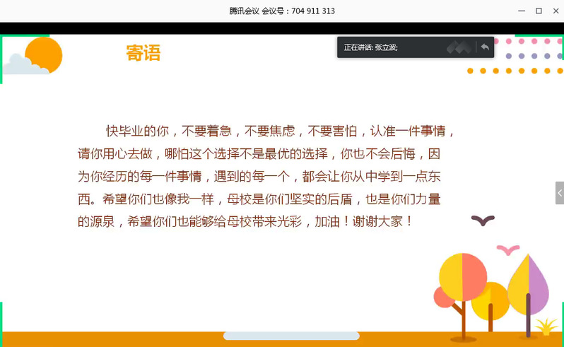 接下来,受邀参会优秀毕业生进行了经验分享。上海市残疾人康复职业培训中心的张立波老师结合自身成长进步经历,阐明老员工职业生涯规划的重要性,希望同学们寻找自己的职业定位,在学习上要虚心好问、积累沉淀,在工作上要有“利他”思想、与人为善。安徽省宣城市特殊教育中心的杨景老师分享了经验,他就如何结合自身专业理想做好就业创业规划,建议同学们要不断思考,尽快学习储备并提升相关能力、学识及素质,做好大学期间学习及下一步职业规划。海南省东方市特殊教育公司的韩鑫宇、李淑亚两位老师交互发言,她们针对特殊儿童的实际情况开展个性化教学活动,与大家分享了教学经验,还勉励美术学专业员工们要不忘初心,不断提升教师道德素质和专业素养,在未来工作中继续历练和升华,为实现自己的人生价值而继续努力。