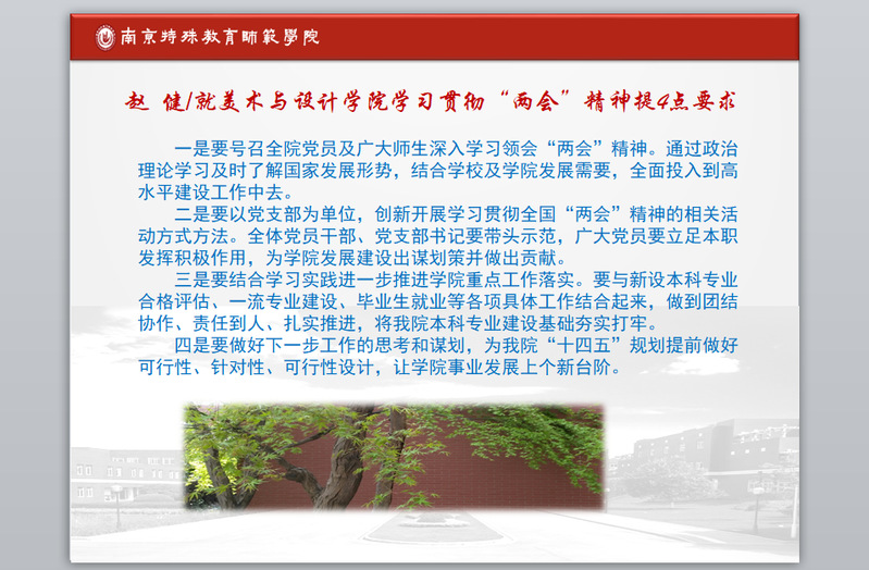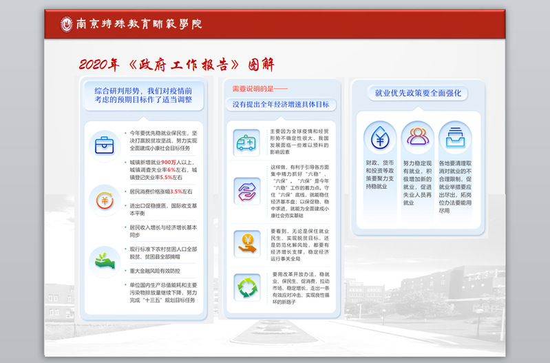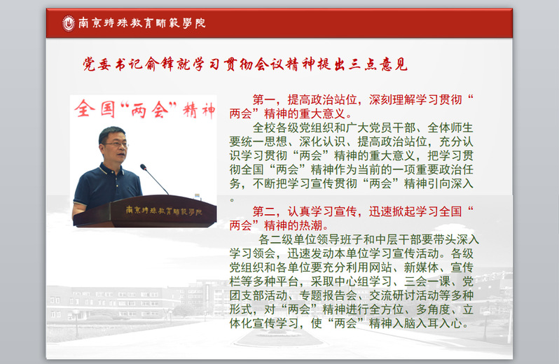会上,结合政府工作报告就2020年全国两会召开情况,赵健书记与同志们研读了新的变化及发展成果,对政府工作报告中有关教育、残疾人就业、疫情防控等热点问题进行强调。随后,他传达了公司党委书记俞锋在全省教育系统传达学习2020年全国两会精神视频报告会上的3点讲话精神,要求结合两会精神学习在工作中实践落实。
