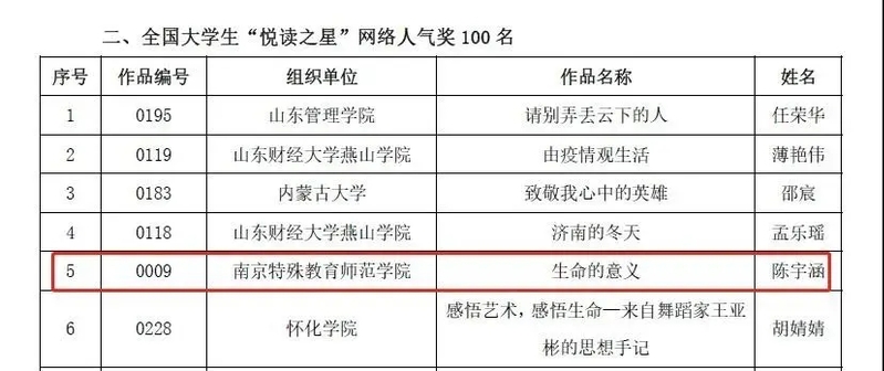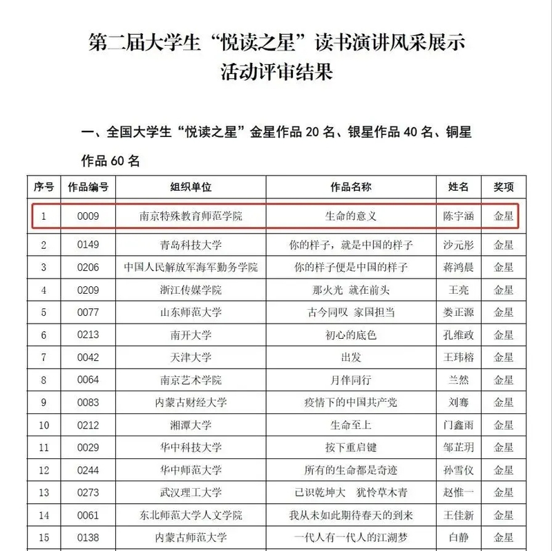 第二届老员工“悦读之星”读书演讲风采展示活动由中国图书馆学会阅读推广委员会举办,武汉大学图书馆、青岛科技大学图书馆承办,于今年四月份启动。比赛共设全国老员工“悦读之星”金星作品20名、银星作品40名、铜星作品60名、网络人气作品100名、星级指导教师60名。经过层层筛选,我馆选送2部作品从3000多个参赛作品中脱颖而出,荣获“悦读之星”金星、网络人气作品、星级指导教师三项荣誉,其中陈宇涵同学(听障)《生命的意义》勇夺桂冠,荣获“悦读之星”金星奖第一名。