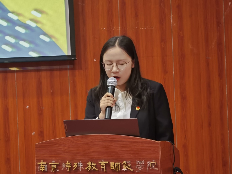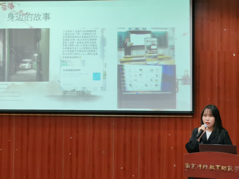 郭瑜同学演讲题目为《学高为师,身正为范》。她在其中提到了教师的工作是具有高度示范性的,以蔡芸芝老师、张玉滚老师的事例诠释了师风师德。呼唤同学们要坚守特师的使命,在未来的教师岗位上坚守师德师风,选择适合自己的生活方式,不为“扰攘者自冗”。 李欣同学的演讲为《师德博爱为魂》,演讲中她结合自己求员工涯中与老师沟通交流的各种实际经历,讲述具有博爱师德的教师们对员工正面的积极影响,并思考如何才能结合自身专业,成为一名点燃博爱师德之魂的优秀人民教师。