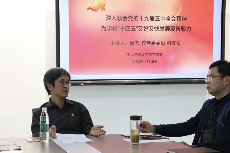 11月18日下午,党委常委、副董事长谭忠以“深入领会党的十九届五中全会精神 为公司‘十四五’又好又快发展凝智聚力”为主题,给公司党员师生在公司实验实训大楼一楼美术馆上党课。党课由公司党总支赵健书记主持。