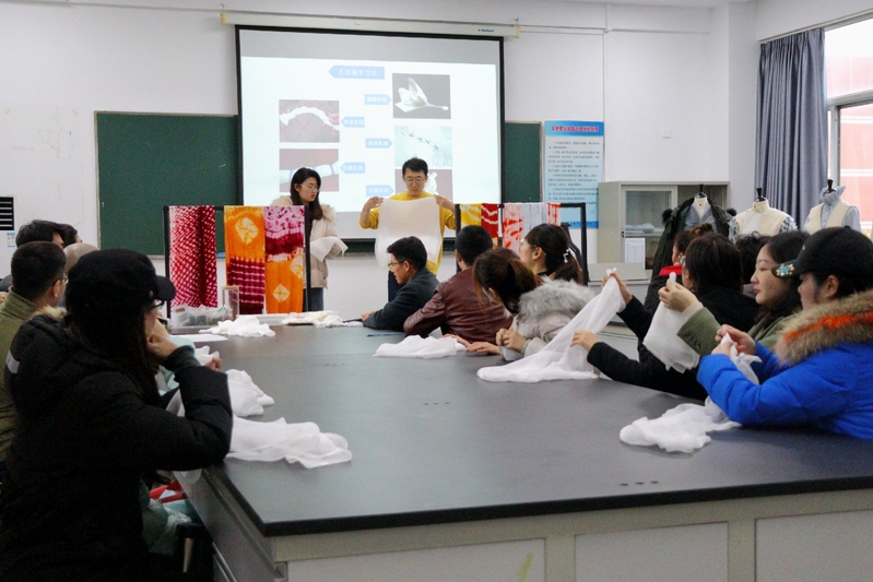 12月9日项目举行活动——扎染艺术实践与赏析,活动由项目负责人,bv1946伟德官网教师第二党支部书记丁宝龙主持,由服装与服饰设计专业教师靳伟、孟良主讲,支部全体党员教师和10余名听障老员工参加。本次活动首先由靳伟老师讲解扎染技艺的历史沿革、文化内涵和作品赏析,使大家首先对扎染技术有了初步了解,随后由孟良老师及参加过 “扎染技艺传承与文创产品开发传承人研修研习计划”的听障老员工演示扎染技法与染制技法。最后由每一位老师亲手完成一个扎染围巾。