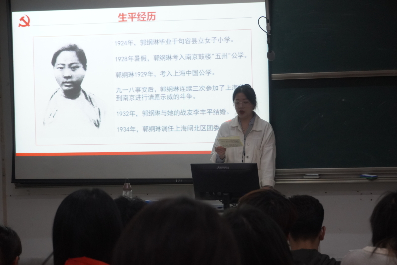 赵佳雯同学的演讲分为郭纲琳同志的人物介绍、生平经历、革命斗争和人物评价这四个方面,让在座同学对郭纲琳先辈有了更深刻的了解。郭纲琳同志一腔热血号召成立抗日救国会,她英勇无畏多次参加请愿示威斗争,哪怕身陷囹圄也从容不迫,她用她的一生将“巾帼不让须眉”描绘的淋漓尽致,就连英国记者称她是中国最了不起的女性!