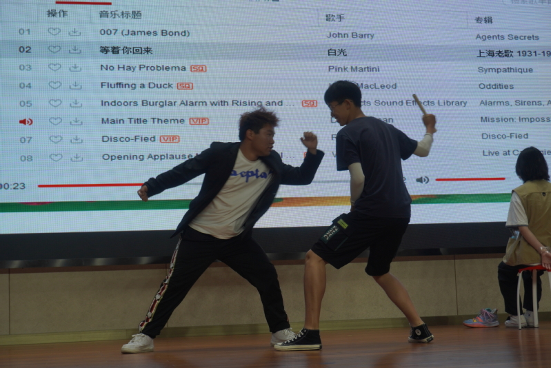 在指挥朱婧同学的指挥下,两位特工缓缓来到舞台中央,向观众展示了自己的特殊才能,又用不同方法逐一制服了门口的守卫(李政、叶文玉、徐润元饰演),见到了人质(朱唯婷饰演)。面对定时炸弹他们慌乱起来,为了不让人质受到伤害,他们采取各种方法解救人质。虽然一路艰辛坎坷,但在两人的努力之下,任务最终成功。