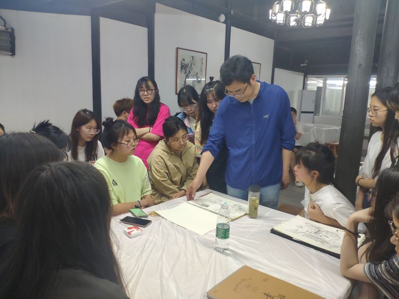 赵健书记在参观学习之余,看望了正在荡口古镇写生的美术学18级员工,并和员工们进行了深入交谈,对员工的写生作业进行了点评。