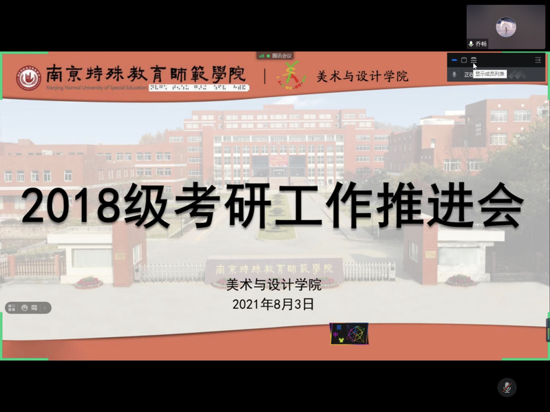 会议邀请了南京艺术公司研一员工乔畅、南京师范大学研三员工夏安琪、金诚立老师分享考研经验。乔畅同学鼓励大家备考期间一定要有信心,并且从政治和英语方面,分享了很多自己的复习方法;夏安琪同学通过思维导图的方式罗列出考研的时间节点,从确定目标、复习备考、初试、复试等进行详细的介绍;金诚立老师主要从学硕和专硕的区别进行细致的讲解。