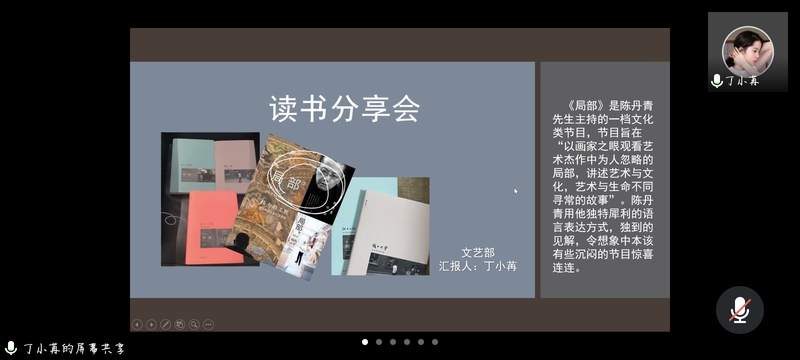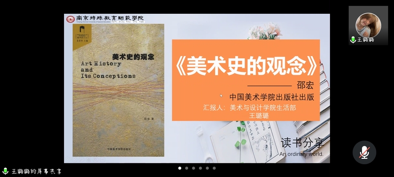 杨溁宁同学分享了《中国美术史》,从历史文脉展示清楚,图文并茂、内容详实,通过学习,综合素质得到了提高。吴世凡同学分享的《艺术的故事》,“实际上没有艺术,只有艺术家。”介绍了这本书的导论,通过读书同学们理解了什么是艺术,艺术家的创新很重要。刘嘉怡同学分享的《中国美术史百题》,通过学习一个专题,学习到了理论联系实际,别具一格的艺术风格,学习了我国美术史的发展历程。邵蔚同学分享的《设计中的设计》,谈读后感,了解了设计是什么,注重思考对设计的重要性,简约对艺术的重要。郑倩同学分享了《艺术的故事》,通过学习,了解了艺术的不同类型,每个人对艺术的评价是不同的,提高了艺术思考力。丁小苒同学分享的《局部》,通过读千里江山图,学习到不要忽略绘画作品的局部,了解到文化对艺术的重要,对中西方艺术的探索。王璐璐同学分享的《美术史的观念》,上下两篇,读了文章,欣赏赏析后深受启发。黄佳康同学分享了《美学与意境》,学习到中外美学思想、艺术发展的人生观不同,艺术的境界也不同。徐千惠同学分享的《每天读一点色彩心理学》,学习到以漫画、插图等生动、色彩活泼的形式,来适应人们的心理需求、环境需要。吴谢一同学分享的《美的沉思》,学习到理性之美、审美的自由,了解到了美不但是技术,也是人类的精神传承。郜哲同学分享的《草木染大全》,了解了染色方法、染色需要注意的问题,还有染色的计较,十分实用,全面提炼用色能力。李宏教授对此次同学们的读书分享进行了精彩的点评和总结。他认为读书是一个永恒的话题,并建议同学们将读书作为一个能坚持下去的爱好。