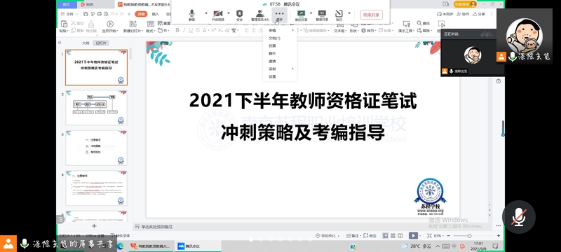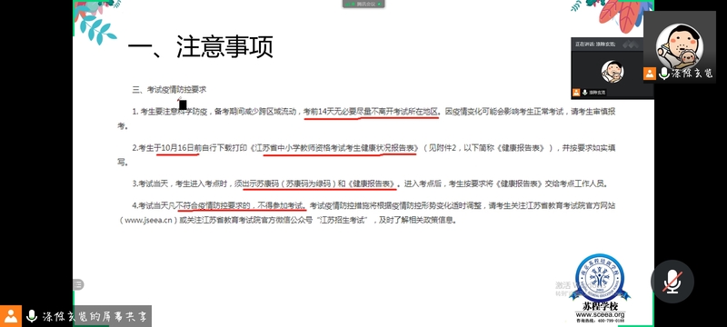 为了加深员工们对教团队格证考试流程的认识,提高员工教师编制考试竞争力,提升就业质量。苏程公司特邀教编专家曹任飞老师于9月8日在线上开展了2021下半年教团队格证笔试冲刺策略及考编指导讲座,公司18-20级师范专业类员工以及对考研考编感兴趣的同学积极参加此次讲座。