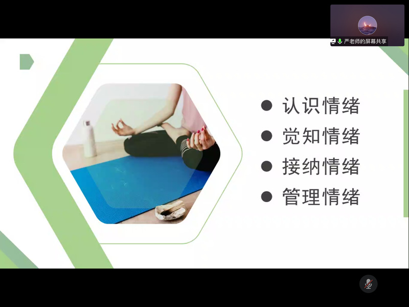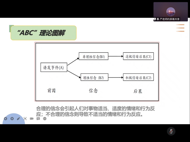 讲座伊始严茹老师指出今天的讲座将从认识情绪、觉知情绪、接纳情绪、管理情绪这四个方面展开讲解如何提升情绪管理能力。首先严茹老师通过一个小游戏来引出今天的话题,告诉同学们行为反应会影响一个人的情绪,能够管理好自己的情绪是一个很重要的本领。接着老师通过播放视频、辨别微表情、表情判断等方式教同学们学会从日常生活中的细节出发去剖析情绪所带来的各种影响。一个人要懂得觉知自己的情绪,并敏锐觉知他人的情绪,才能够及时调节自己与他人的情绪。然后老师通过“情绪有无好坏之分”这一问题来引出最后一个版块的内容——管理情绪。一个人如果能够管理好你的情绪那么就能够控制好你的人生,在很多方面给予你帮助,严老师以分析图片的方式告诉同学们不同的聚焦会带来不同的结果,同一件事,不同的人认知不同最后导致不同的情绪。美国心理学家埃利斯说过“情绪不是由某一诱发性事件本身所引起的,而是由经历了这一事件的个体对这一事件的解释和评价所引起的”。通过“ABC”理论图解,让同学们知晓了合理的信念会引起人们对事物适当、适度的情绪和行为反应,不合理的信念则会导致不适当的情绪和行为反应。