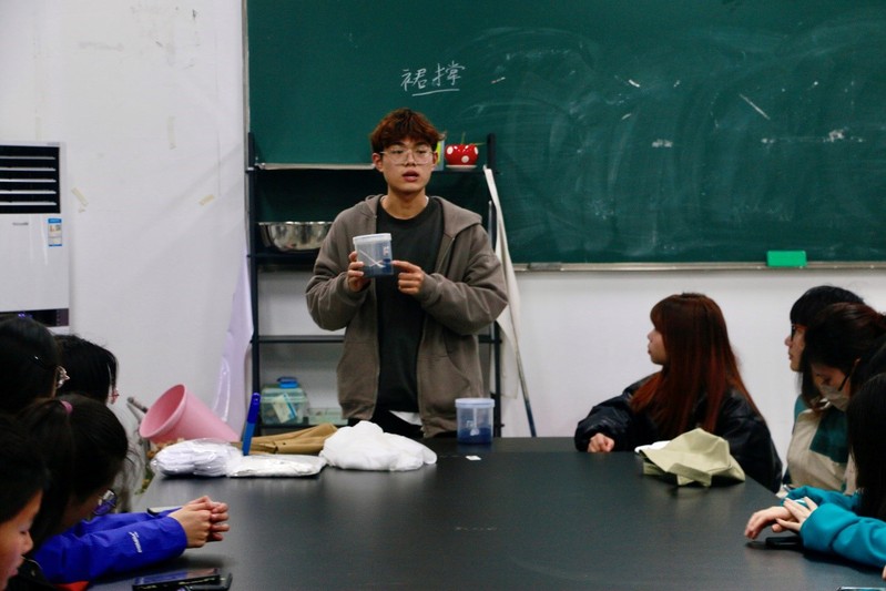 第二次学风建设活动共有四个课程目标,首先由王佳乐同学向大家介绍了扎染基础知识,即扎染常用的两种染料是化学染料和植物染料,随后简单介绍了一种基础扎法——云染,也是本次课程所要运用到的扎染技法。接下来由学长学姐分组向大家介绍各种扎染技法,并让大家自己动手对方巾进行制作。在制作过程中,同学们十分投入,创作出自己喜欢的图案纹样,感受扎染的独特魅力。