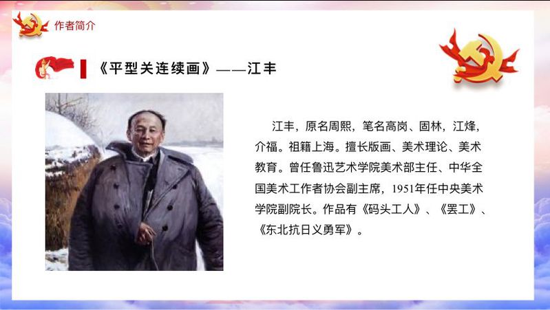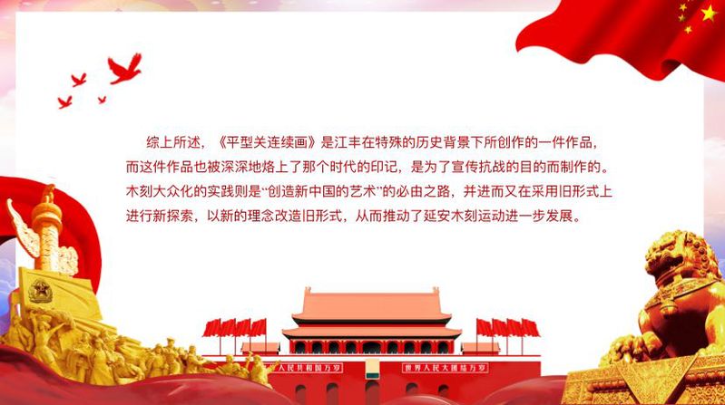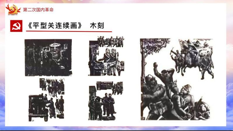 学习会上,张一帆同学围绕历史回顾、作者简介、作品赏析、汇报总结四个方面带领同学们深入学习了木刻作品《平型关连续画》。1937年9月,日军先后投入重兵,向华北腹地展开战略性进攻,扬言三个月内灭亡中国。在大片国土沦丧、民族生死存亡之际,中共中央通过了抗日救国十大纲领,提出了争取抗战胜利的全面抗战路线。8月25日,中共中央军委发布命令:将中央红军改编为八路军。9月,八路军主力115师、120师,从陕北东渡黄河,奔赴华北抗日前线。在朱德总司令的命令下,八路军115师全员进入平型关设伏,打败了日军,取得了抗战爆发以来的第一个胜仗,这就是著名的平型关大捷。1938年,版画家江丰根据平型关大捷的战斗场景,完成了作品《平型关连续画》。