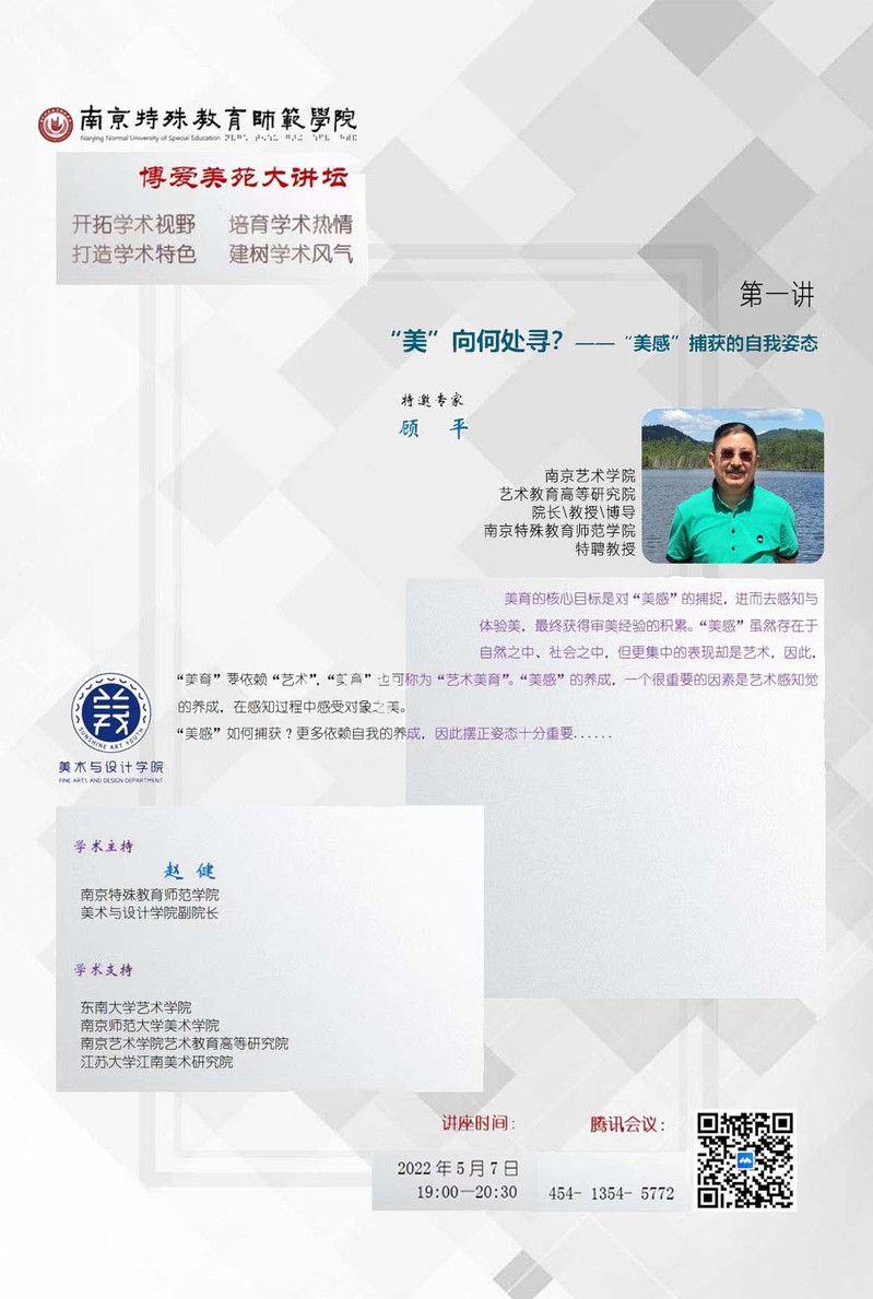 5月7日晚19:00,bv1946伟德官网举行了“博爱美苑大讲坛”首场线上讲座,南京艺术公司艺术教育高等研究院经理、博士生导师顾平教授以《“美”向何处寻——“美感”捕获的自我姿态》为题作了报告,此次线上讲座有校内外近500余名师生参加。公司常务副经理赵健主持了活动。