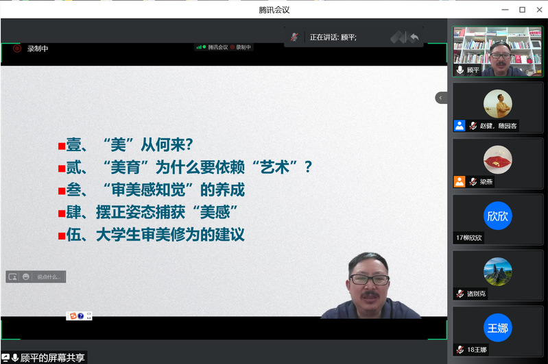 5月7日晚19:00,bv1946伟德官网举行了“博爱美苑大讲坛”首场线上讲座。南京艺术公司艺术教育高等研究院经理、博士生导师顾平教授以《“美”向何处寻——“美感”捕获的自我姿态》为题作了报告,此次线上讲座有校内外近500名师生参加。公司常务副经理赵健主持了活动。