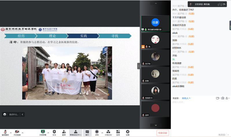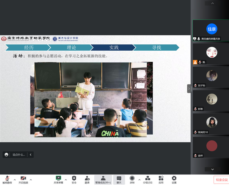 讲座开始,美术2001班黄佳康同学从“经历、理论、实践、寻找”四个方面进行分享,他表示,进入大学后,自己通过参加员工工作、志愿活动得到锻炼,在学习之余不断拓展自己的新技能,建议在场同学能够合理有效的规划自己的老员工活。然后是美术2002班秦焕杰同学进行分享,他为同学们讲述了自己在追求目标的道路上,虽受挫折,但是永不放弃的种种事例。只有积极面对失败,努力奋斗,才能成为更好的自己。接着,美术2003班徐千惠同学与美术2004班高许诺同学进行分享,两位同学表示大学就是要“动起来”,通过课堂内外的学习和实践,不断积累经验,从而得到自我的提升。最后,美术2006班许睿佳同学分享了自己对专业的认知与理解。
