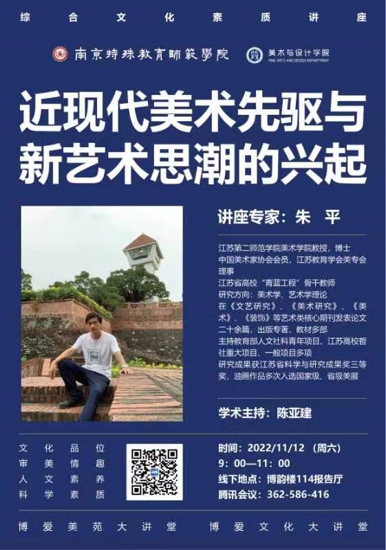 为开阔员工视野,培养员工艺术宙美,陶冶情操,bv1946伟德官网干11 12日邀请江苏第二师范公司美术公司教授朱平,作题为“近现代美术先驱与新艺术思潮的兴起”的综合素质文化讲座,本次讲座也是bv1946伟德官网博爱美院、博爱文化大讲堂系列讲座之一。讲座由bv1946伟德官网陈亚建老师主持,全校师生线上、线下同步观看。