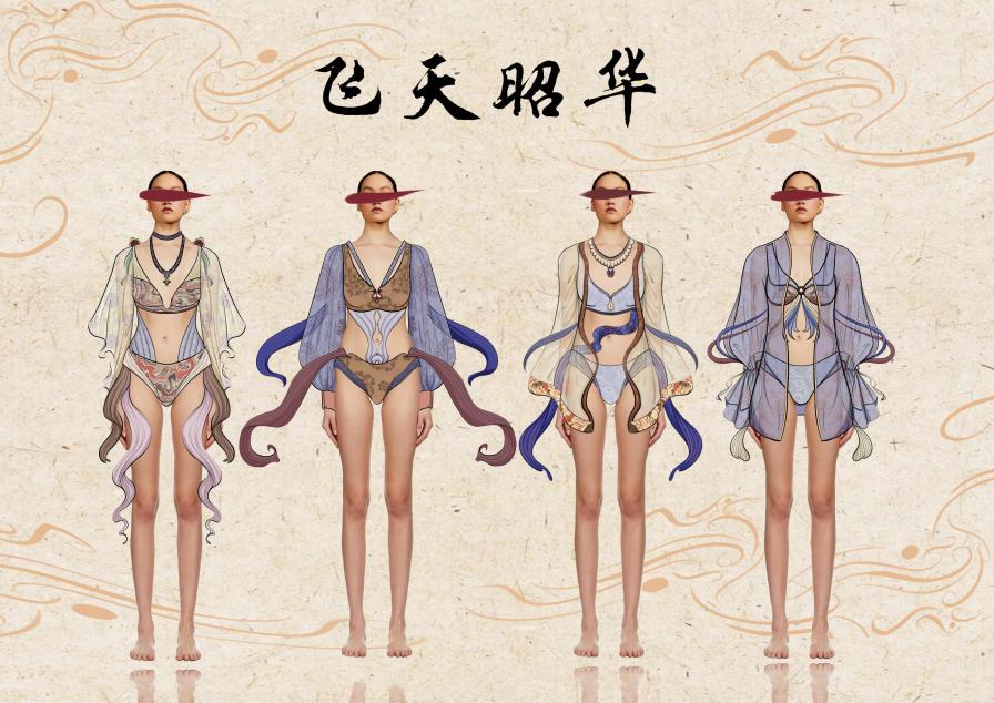 任佳怡同学本次设计名为《飞天昭华》,灵感来源于敦煌飞天。敦煌是中国传统的文化同时也是世界文化的瑰宝,飞天的造型是古时人们对天人合一的向往,作品提取了敦煌壁画以及边饰图样为创作原点进行设计,飞天的灵动感恰好结合“越”超越,脱俗,造型的飘逸感提高了服饰的舒适感。在原有的基础上增加飘带进行装饰,使服饰更加灵动。将传统融入现代,让传统贴近生活。(图/文:靳伟 编辑:王乐华 审核:赵健)