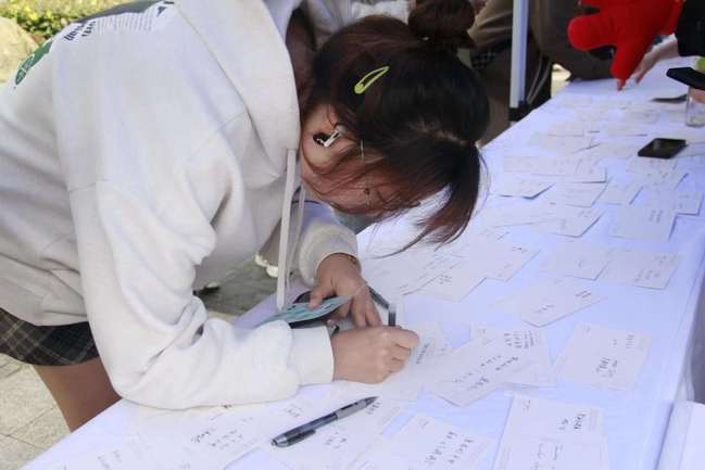本次游园会共有两项活动,在“心灵交换—做彼此的灵魂摆渡者”活动中,同学们真诚地写下暖心的问候和祝福,希望能找到心灵相通的伙伴,互为彼此的灵魂摆渡者,能够在日常生活、学习中鼓励对方,给予彼此力量。“心随路转”活动更是热闹非凡,同学们激动的参加比赛,每个人的身上都洋溢着青春活力的气息。