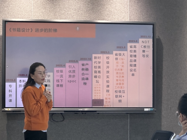 会上郑老师从《书籍设计》课程的建设阶梯、美育课程的申报、NDTC教学竞赛三个方面,分享了自己四年来在专业课教学、精品课程申报及教学竞赛准备等方面的思路、材料及感悟,深入细致地阐述了自己在教学、科研方面所作的“特色立课”探索。分享结束后,郑老师与参会老师们进行了深入的交流,就大家关心的问题进行了精彩的现场解答。针对美院一线教学的若干问题,教师们畅所欲言,也对未来的教学科研方向有了更清晰的认识。本次教研活动轻松温暖、愉快充实,展现了美院对教学质量和教师发展的重视,期待未来美院有更多的教学成果涌现。(文/陈亚建 郑晓 图/李超 编辑/王乐华 审核/刘学 薛皓洁)