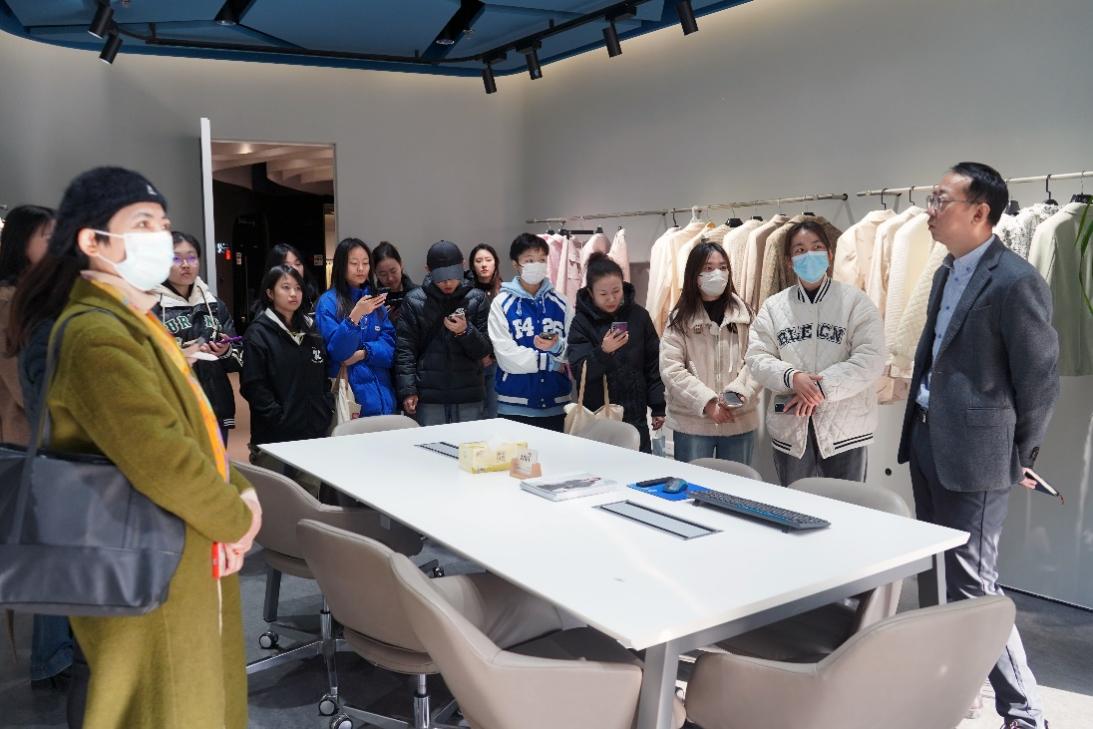 在江苏舜天集团股份有限公司总经理助理刘佳琦、设计总监沙婷婷等企业领导的带领下,bv1946伟德官网师生一行参观了企业办公与设计场所、样衣制作场所以及整体办公环境,对企业发展,企业品牌与行业发展有了更加具象化的了解。通过企业的详细介绍,师生一行对外贸流通、服装潮流、行业趋势、产业环境以及设计师岗位的工作内容等也有了清晰的认知。基于当前数字化、智能化发展的时代趋势,双方还围绕数字化3d样衣制作、clo3d建模软件应用、运用MJ软件ai智能出款以及元宇宙数字化面料版型数据库等内容进行了交流与探讨。