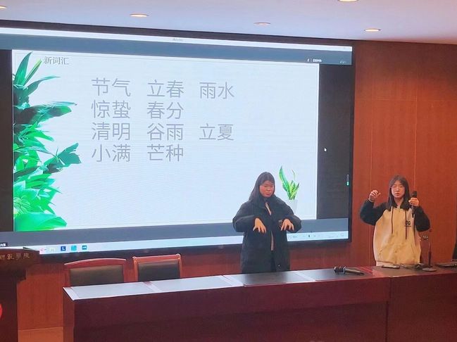 冯兰鑫和夏新梅两位同学作为主讲人,带领同学们回顾了上一期手语培训的学习内容。随后,冯兰鑫和夏新梅两位同学继续带领大家学习新的手语知识,包括二十四节气、地名以及社会主义核心价值观等内容。同学们在手语培训过程中积极参与,认真学习。培训结束后,同学们纷纷表示,本次学习不仅加强了自己对手语的了解,还增强了与听障人士沟通的信心。