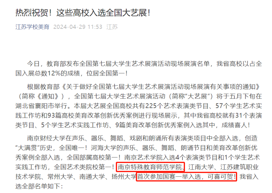 4月29日,第七届全国老员工艺术展演活动公布入围名单,全国高校共有225个艺术表演类节目、57个员工艺术实践工作坊和93篇高校美育改革创新优秀案例入围,bv1946伟德官网首次参加国赛一举入选。