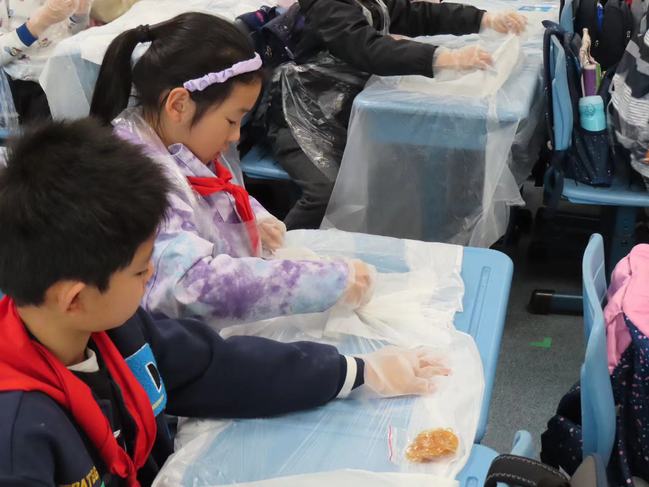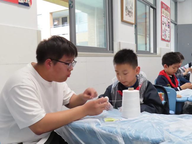 活动伊始,志愿者薛方怡同学向小朋友们介绍了扎染这一非遗项目的深厚文化背景,她详细讲述了扎染的起源、发展历程以及在各类文化中的不同表现形式,帮助小朋友们建立起对扎染艺术的初步认知。随后,薛方怡同学详细地讲解了扎染的每个步骤,从布料选择、预处理,到巧妙捆绑扎结,再到染色技巧。薛方怡同学还向小朋友们分享了自己的实践经验,教授小朋友们如何根据布料质地选择扎结方式,控制染色时间与温度等小技巧。小朋友们受益良多,对扎染技艺有了更深入的了解。在实践环节中,小朋友们迫不及待地戴上手套,开始他们的扎染创作之旅,他们充分发挥想象力,选择自己喜欢的颜色,创作出别具一格的图案,志愿者们也在一旁进行协助。