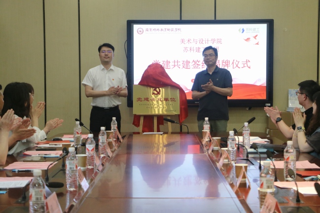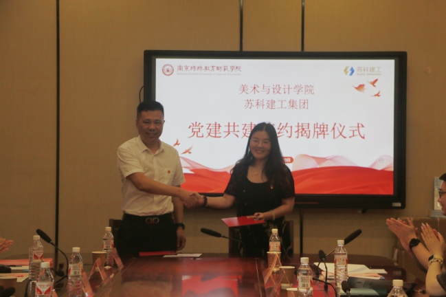 最后,双方举行了隆重的“党建共建单位”签约揭牌仪式。党总支书记薛皓洁与苏科建工集团工会主席王乃雷代表双方签署了共建协议,常务副经理赵健与王作川总经理共同为“党建共建单位“揭牌。会后,双方一同参观了中国特殊教育博物馆。