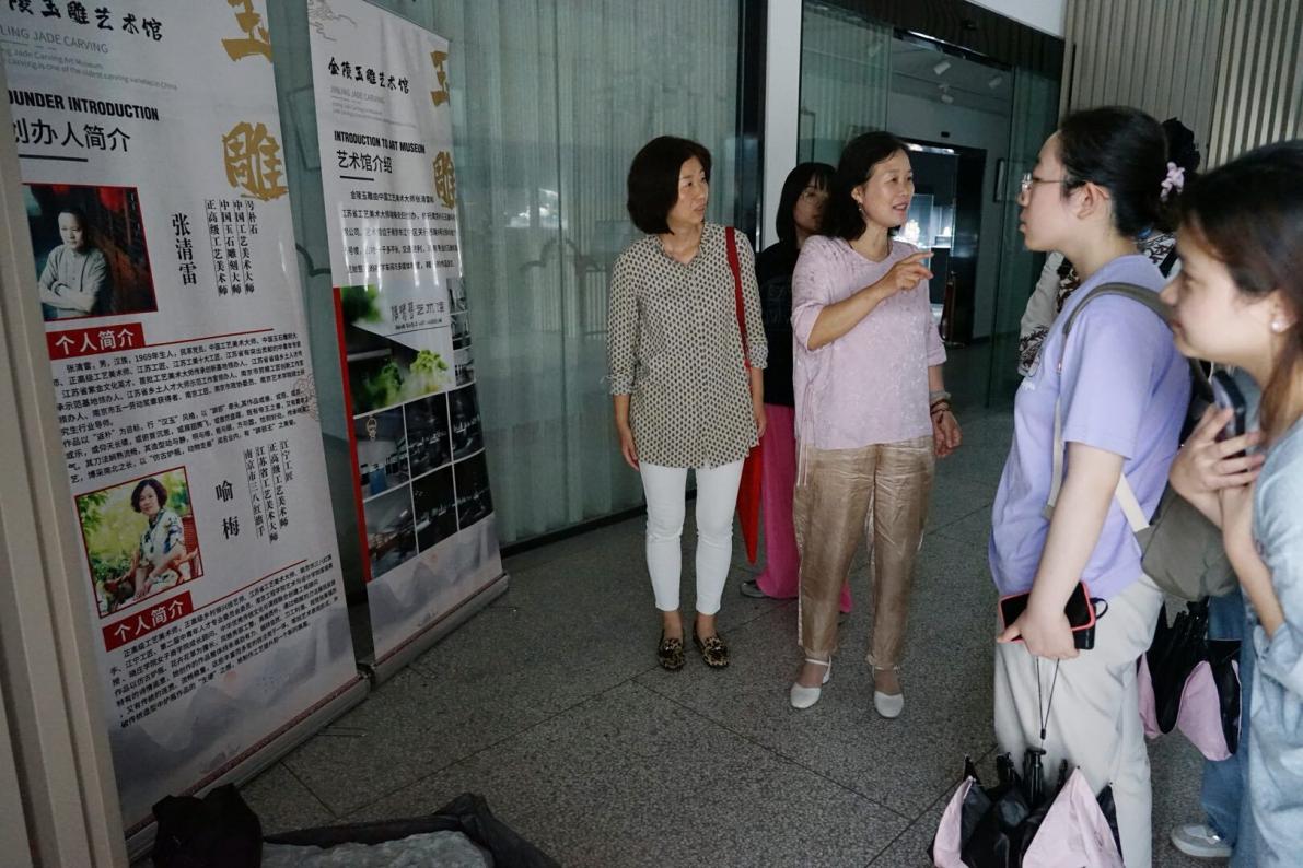 6月25日下午,实践团前往金陵玉雕张清雷艺术馆参观学习。江苏省工艺美术大师喻梅老师热情的接待了我们,为我们一一讲解了精致又别具特色的玉雕,它们的原料,细节雕琢及美好寓意。玉雕是根据不同玉料的天然颜色和自然形状,经过精心设计、反复琢磨,才能把玉石雕制成精美的工艺品。我们还参观了一些玉器做的小配件,制作玉雕的工作台和生产车间,近距离观摩了玉材的切割打磨。