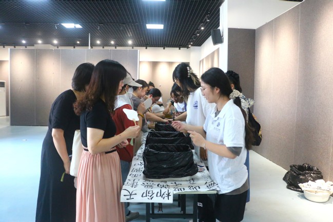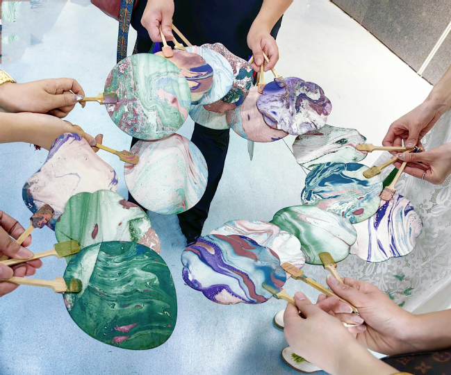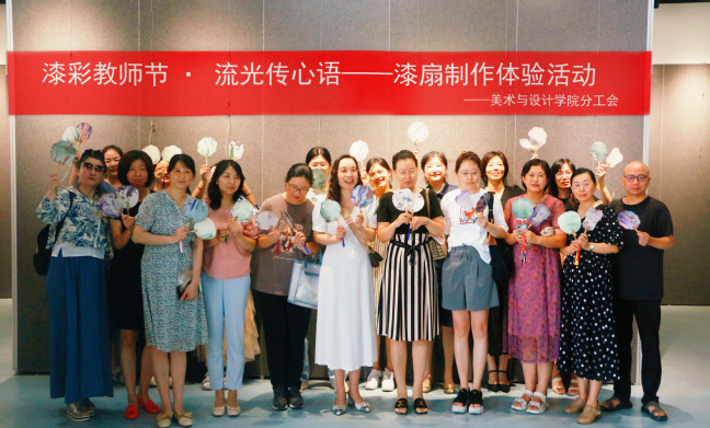 活动中,公司美术学系专业教师张潇为教师们详细讲解了漆艺的历史渊源、制作工艺及艺术特色,让教师们对漆艺这一古老而神秘的艺术形式有了更深入的了解和认识。随后,在员工志愿者的指导下,教师们纷纷动手制作漆扇,一把把原本平凡的扇骨逐渐蜕变成为一把把精美绝伦的漆扇,它们不仅承载着教师们对美的追求与创造,更寄托了他们对教育事业的热爱与奉献。