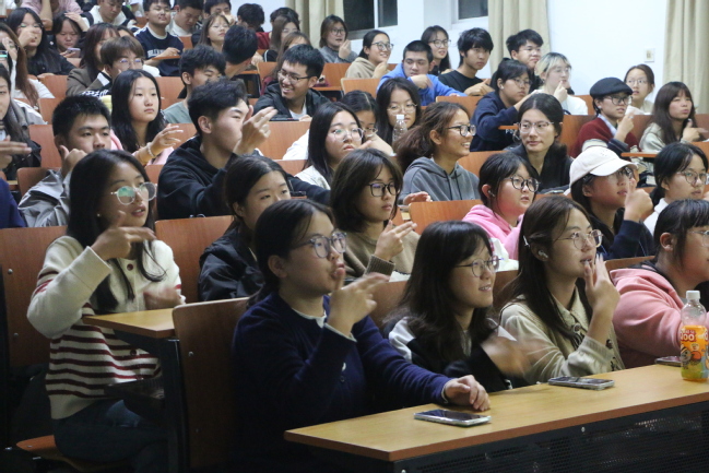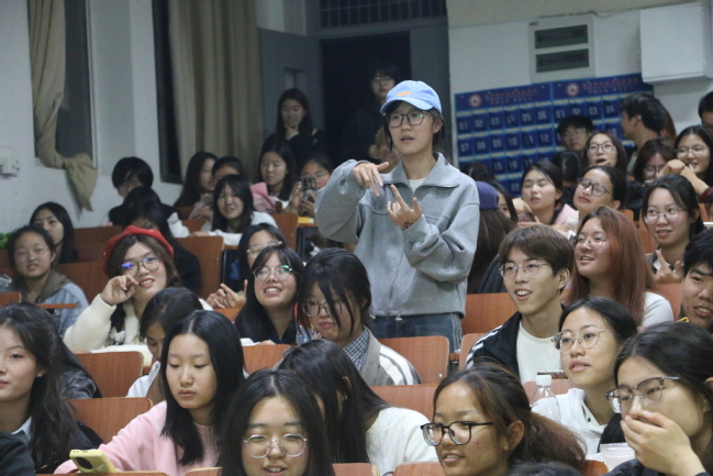 韩苏同学通过形象的演示和生动的讲解,详细地介绍了手语的发展以及在日常生活中的重要性。从基本的手指字母到常用的词汇和短语,再到完整的句子表达,同学们认真地学习,积极互动,努力掌握每一个手语动作。在培训过程中,主讲人韩苏同学还设置了互动环节,让同学们在实践中更好地运用所学手语知识。同学们纷纷表示,通过这样的方式,不仅提高了手语运用的熟练度,还深刻体会到了听障生的生活状态和需求。