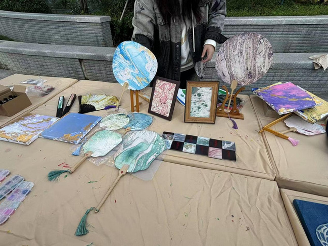 活动当天,漆艺社的各位同学精心布置了现场的摊位,他们带来了自己制作的精美漆扇、扎染文创以及可以现场制作螺钿发簪的材料,供参与观众体验。刚布置好就吸引了不少人围观并学习制作,活动过程中更有不少小朋友对此感兴趣,漆艺社孙邹同学对小朋友们进行了细致且专业的指导。漆艺社宣传部长韩陈婧婷同学向在场的人介绍道:“漆扇的魅力在于:以漆为笔,以水为画,一半人为,一半天成。漆扇的美源于大自然,每一把漆扇在这世上都是独一无二的存在。”在活动结束时,有不少参与者购买或带走了自己制作的螺钿发簪以及漆扇,他们纷纷表示在此过程中学习到了中华传统文化,并对此次活动的举办者们送上了真心的感谢与祝福。