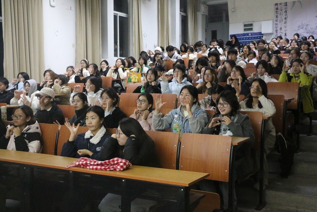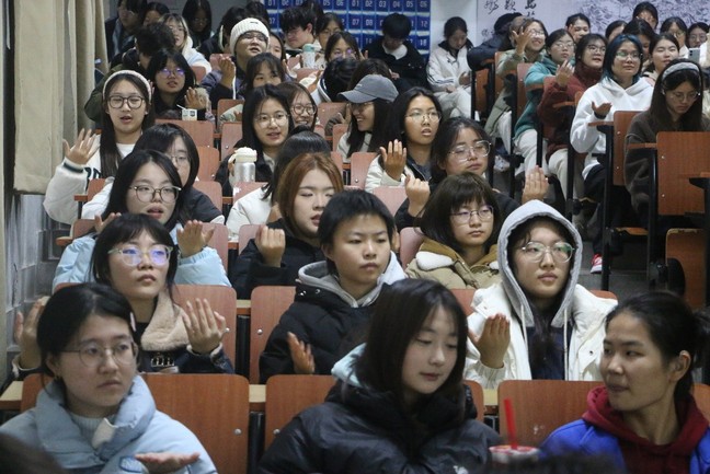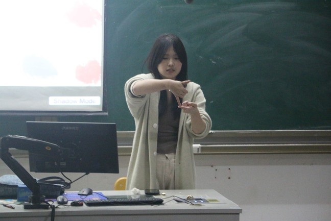 活动现场,王荣同学首先向同学们介绍了国歌手语版的创作背景和重要意义,强调手语作为聋哑群体的语言,能够跨越听觉障碍,传递对祖国的热爱与敬意。在教学过程中,王荣同学以精准的动作示范,逐句分解国歌歌词对应的手语表达,从“起来!不愿做奴隶的人们!”的庄严起势,到“前进!前进!前进!进!”的激昂收尾,每一个手势都饱含力量。