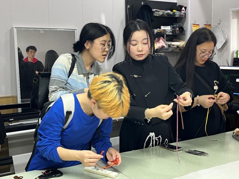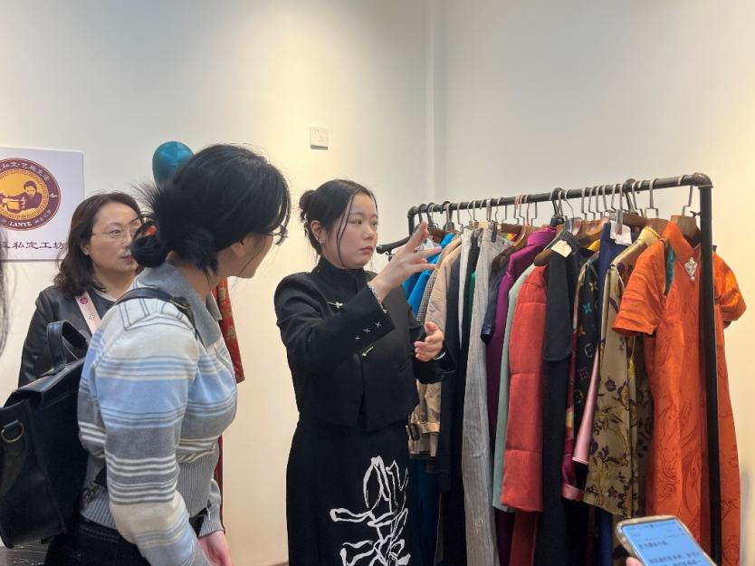 已入职南京卿姿服饰有限公司的20级毕业生代表热情接待南特师生,她不仅热情地迎接了来自母校的师生,还向他们展示了店内的精致服装与配饰,并亲自进行了现场教学与示范,带领大家探寻并学习非物质文化遗产——盘扣技艺。