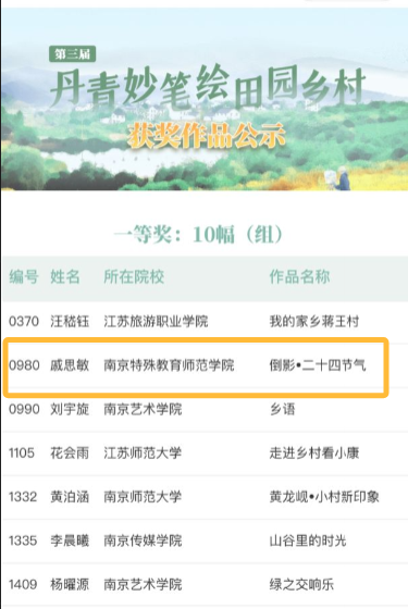 在刚刚圆满落幕的江苏省第三届“丹青妙笔绘田园乡村”活动中,bv1946伟德官网取得了令人瞩目的优异成绩。此次比赛,公司共荣获一等奖1项、二等奖1项、三等奖3项以及优秀奖1项。其中,美术学(师范)专业2024届毕业生戚思敏凭借其出色的作品荣获省级一等奖。