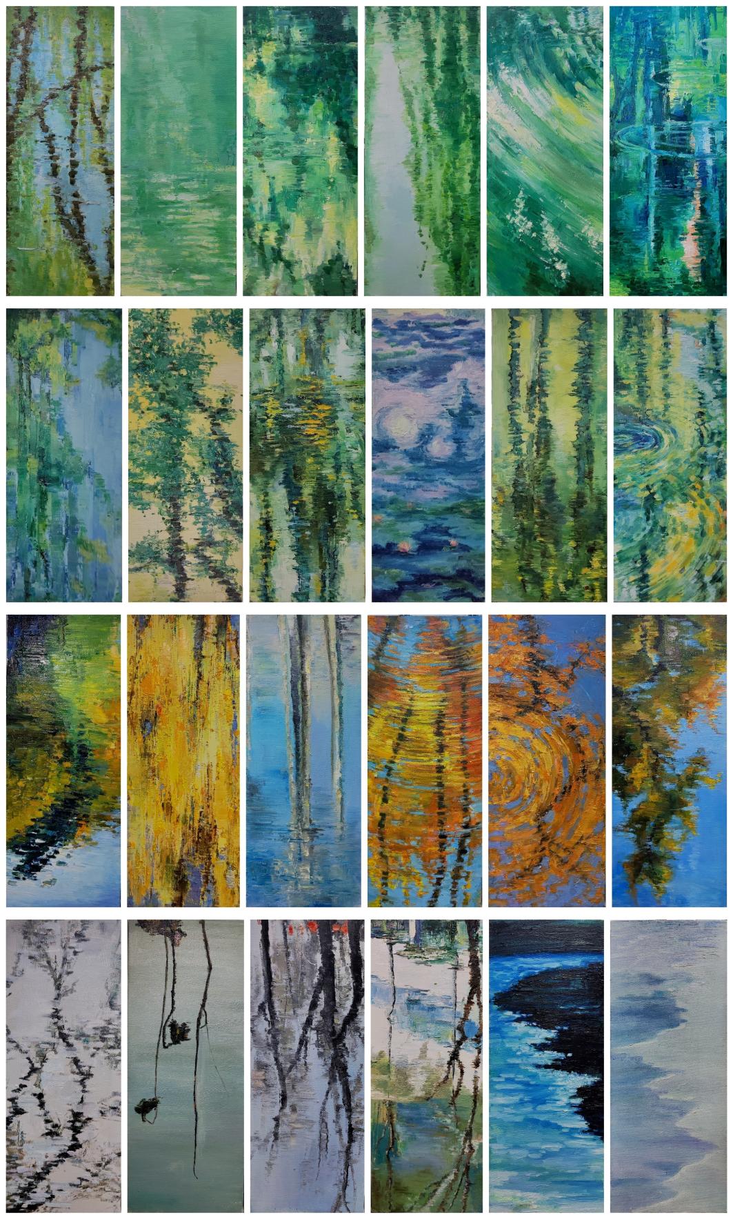 戚思敏同学的获奖作品源自她在bv1946伟德官网的本科毕业创作。这幅油画作品灵感源自公司组织的下乡写生活动,创作历时六个多月,以黄龙岘乡村水塘为原型,通过独特的倒影视角,细腻地描绘了二十四节气各自独特的美感。作品不仅讴歌了自然之美,更表达了对传统文化的尊重和敬畏之情。