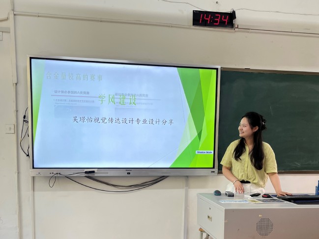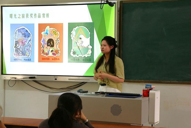 活动以赛事引航拉开序幕。视觉传达设计专业吴璟怡同学分享了几个含金量较高的赛事,如:两岸新锐设计竞赛、米兰设计周高校设计作品展等,并且建议同学们积极关注与参加,以提升自身的专业能力。在作品解析环节,吴璟怡同学以“曙光之窗”为例,分析创作逻辑。鼓励同学们敢于突破,大胆创新。