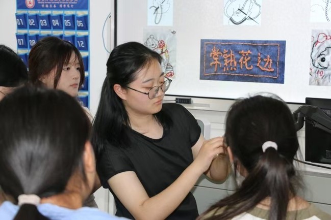 进入实操环节,周珂羽同学亲自进行现场示范。她分步骤细致演示,对每一个细节都进行了耐心讲解,将三种针法的具体操作技巧毫无保留地传授给同学们。随后,同学们充分发挥自身的专业特长,积极运用所学针法,在布料上自由挥洒创意。他们巧妙地将传统技艺与现代设计理念相结合,绣制出一幅幅各具特色的图案。活动现场气氛热烈非凡,同学们沉浸在传统工艺的魅力之中,不仅感受到了匠心的温度,还在实践中显著提升了艺术创作与动手实践能力。
