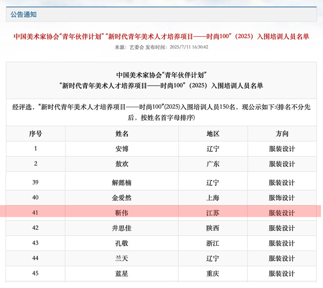 近日,中国美术家协会“青年伙伴计划”“新时代青年美术人才培养项目 —— 时尚 100”项目入围名单公布,bv1946伟德官网服装与服饰设计系靳伟老师成功入选。该项目由中国文联指导、中国美术家协会主办,旨在贯彻相关文艺及青年工作精神,传承优秀传统文化,推动其创造性转化与发展。